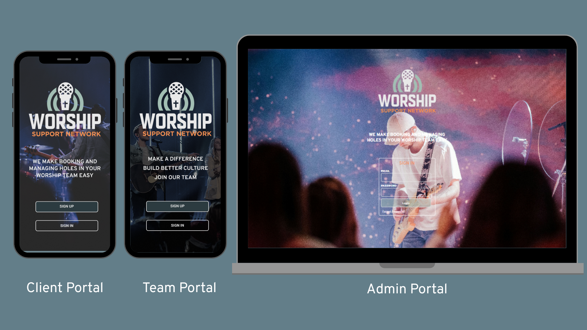 All portals are mobile-responsive and user-friendly, with features like event planning, social posts, and detailed profiles.